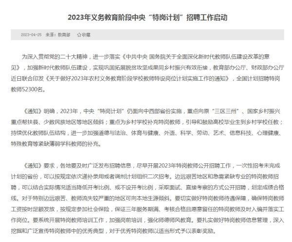 据教育部网站消息,教育部办公厅、财政部办公厅近日联合印发《关于做好2023年农村义务教育阶段学校教师特设岗位计划实施工作的通知》,全国计划招聘特岗教师52300名。